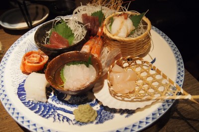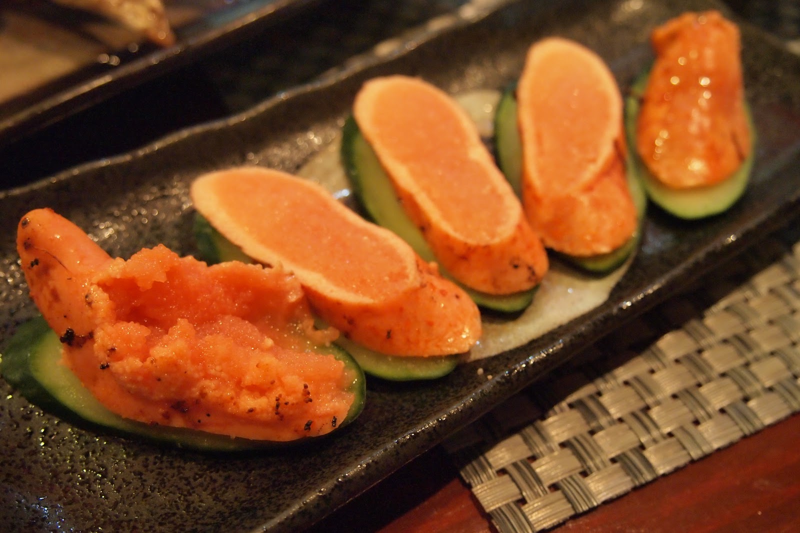 隨意的點了炸雞塊作前菜,精緻的魚生、烤一條未見過的魚,且點一條肥美烤墨魚。有點意猶未盡,就追加了看似是芥末墨魚鬚的小吃,黏黏稠稠的看起來不太對胃口,可是一吃進去,芥末的澀辣味吊起了墨魚鬚的鮮味,好甜好香啊!