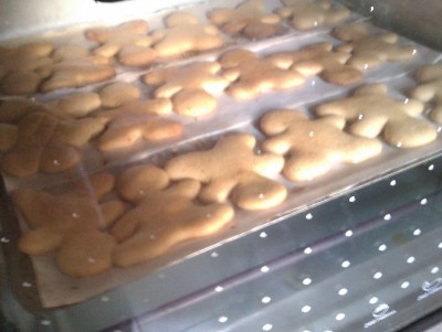 蓋人仔時,手工笨拙,有些頭拉長了,或手腳扯歪了,卻始覺得每隻人仔都有了自己的性格。終於把薑餅人送進焗爐,像閱兵儀式,看著每隻人仔長大脹大,一室濃濃香香的,竟有了滿足感。但,不虞有詐,焗好的薑餅人全黏在紙上,那在家裡找到的原來是做叉燒包的紙,不是牛油紙。多計仔的爸爸,替我用蒸氣熏一熏,想不到紙便容易撕下來了。但薑餅人給折騰了這麼些時間,不敢獻世,只留了些完好的送人。
