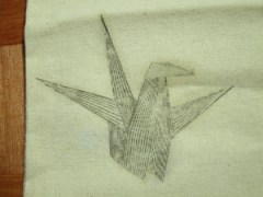 移印前,如果印的是袋子,必要在袋裡夾一層厚白紙,不然會過底。然後把有圖案的一面置於布面,掃上冬青油,油滲進紙裡,再用雪條棍輕輕刮擦,小心別移位,線條就會慢慢現在布上。我試印了一隻紙鶴,因為線條太幼了,有點模糊,只好再用新的一張圖案,就著相同位置再刮一遍。