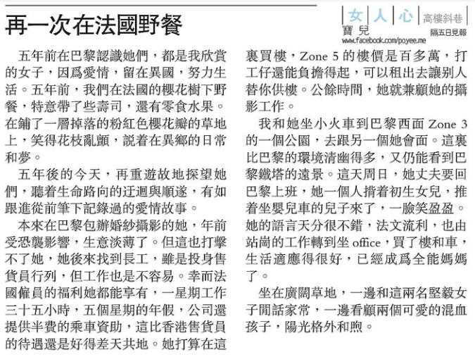 我和她坐小火車到巴黎西面Zone 3的一個公園,去跟另一個她會面。這裏比巴黎的環境清幽得多,又仍能看到巴黎鐵塔的遠景。這天周日,她丈夫要回巴黎上班,她一個人揹着初生女兒,推着坐嬰兒車的兒子來了,一臉笑盈盈。她的語言天分很不錯,法文流利,也由站崗的工作轉到坐office,買了樓和車,生活適應得很好,已經成為全能媽媽了。