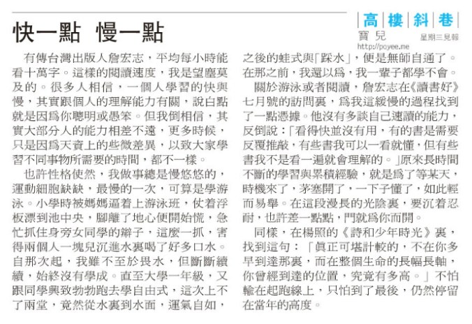 關於游泳或者閱讀,詹宏志在《讀書好》七月號的訪問裏,為我這緩慢的過程找到了一點憑據。他沒有多談自己速讀的能力,反倒說:「看得快並沒有用,有的書是需要反覆推敲,有些書我可以一看就懂,但有些書我不是看一遍就會理解的。」原來長時間不斷的學習與累積經驗,就是為了等某天,時機來了,茅塞開了,一下子懂了,如此輕而易舉。在這段漫長的光陰裏,要沉着忍耐,也許差一點點,門就為你而開。